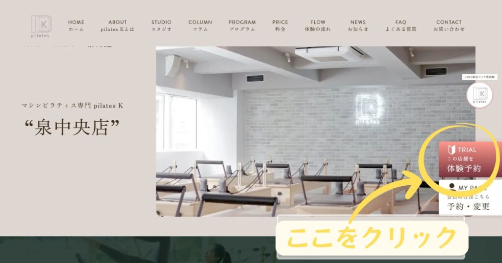 まずはピラティスK泉中央店の公式サイトにアクセスします。