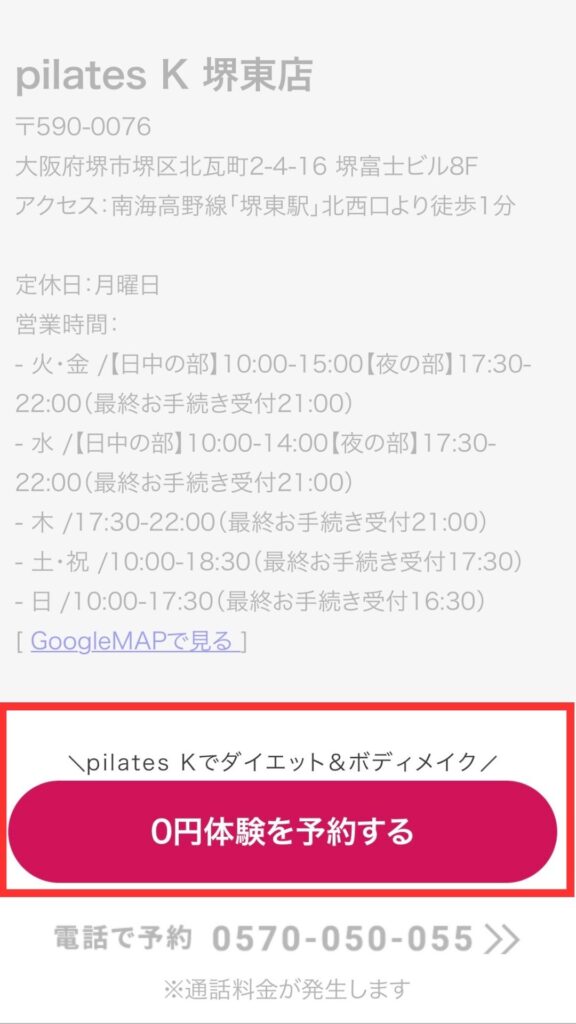 「ピラティスK 堺東店」を選択し、「0円体験を予約する」をクリック