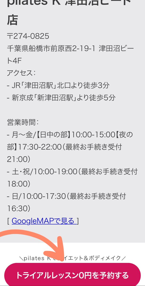 まずは、ピラティスK津田沼ビート店の公式サイトにアクセスします。