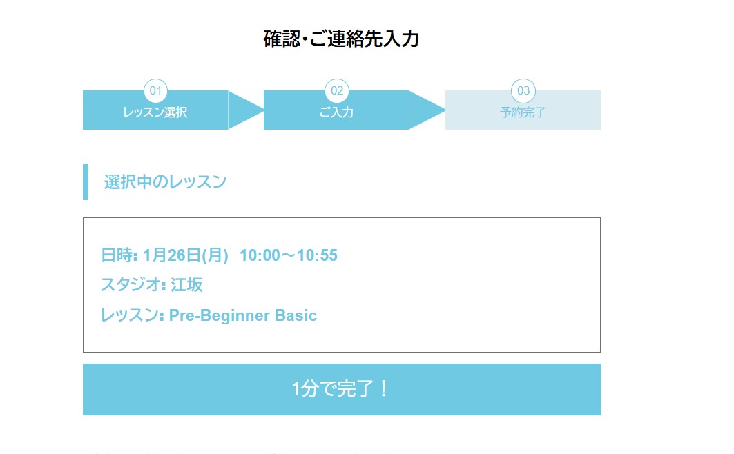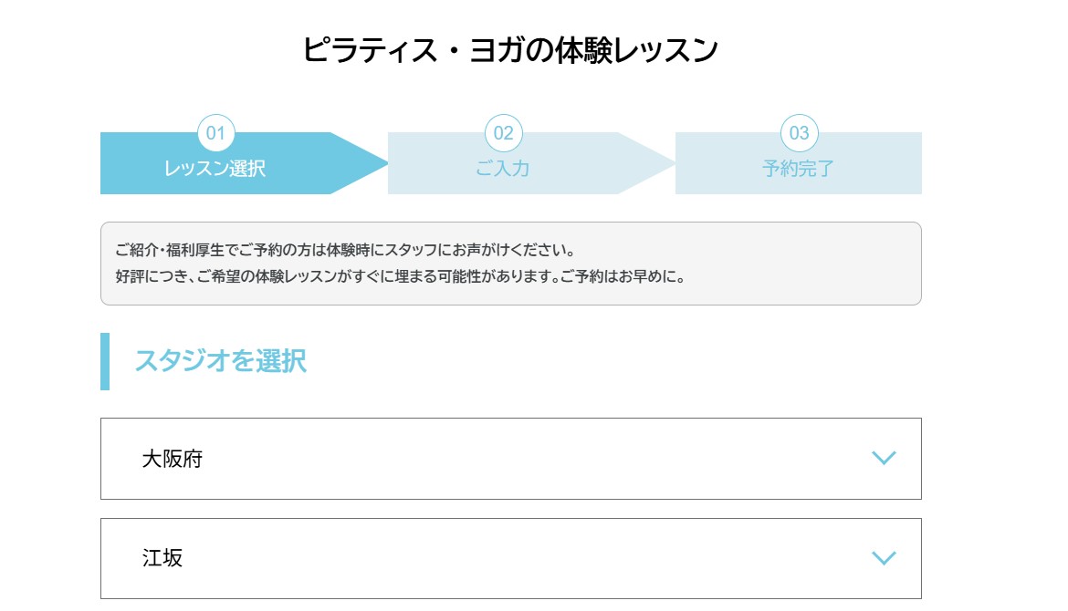 公式サイトの「体験予約」から、体験レッスンの希望スタジオ・コース・日程を予約する