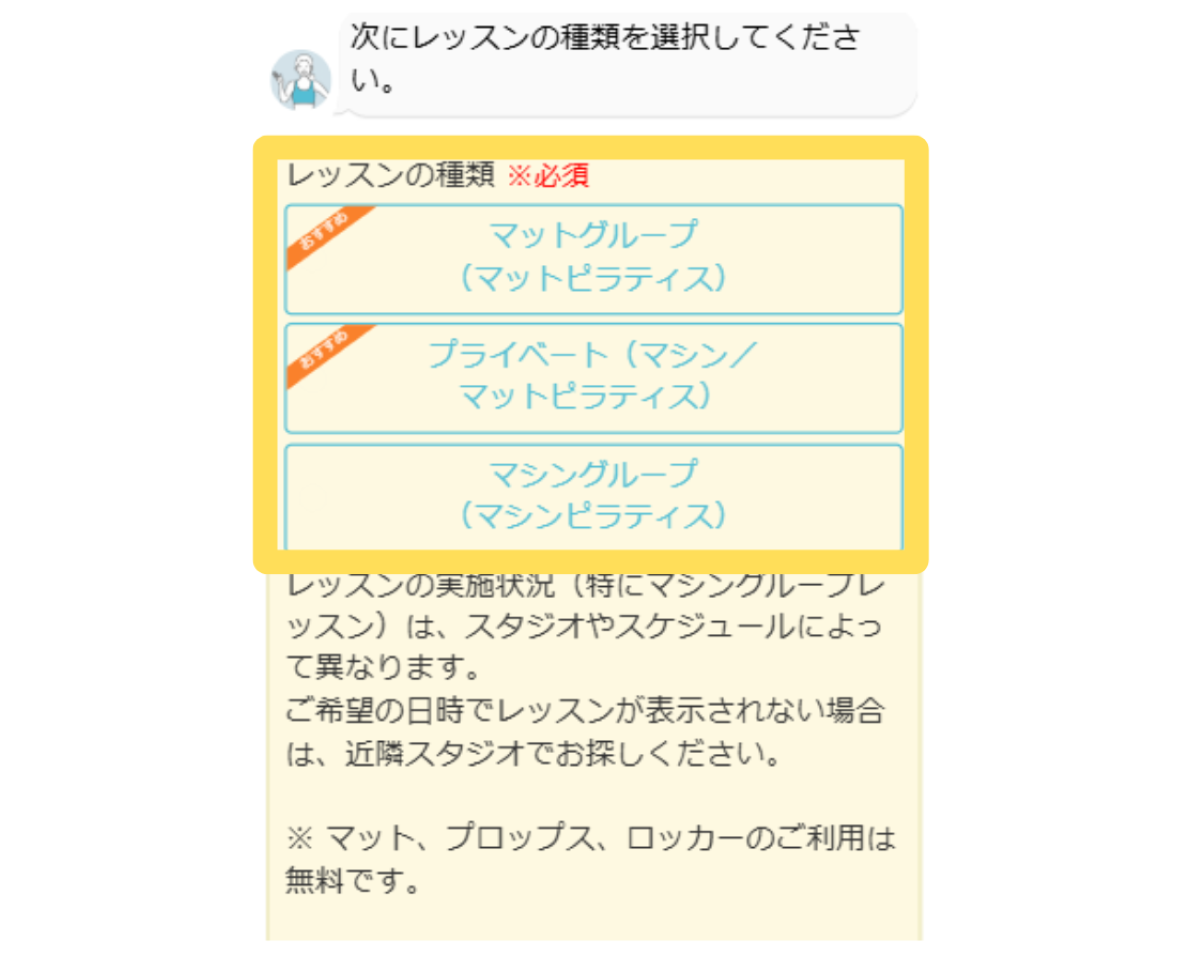 ②「名駅店」であるか確認ののち、希望レッスン種類の選択へ