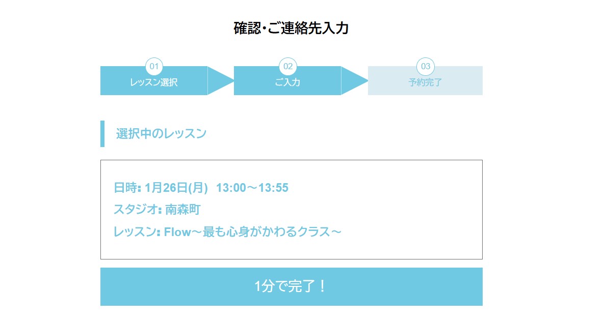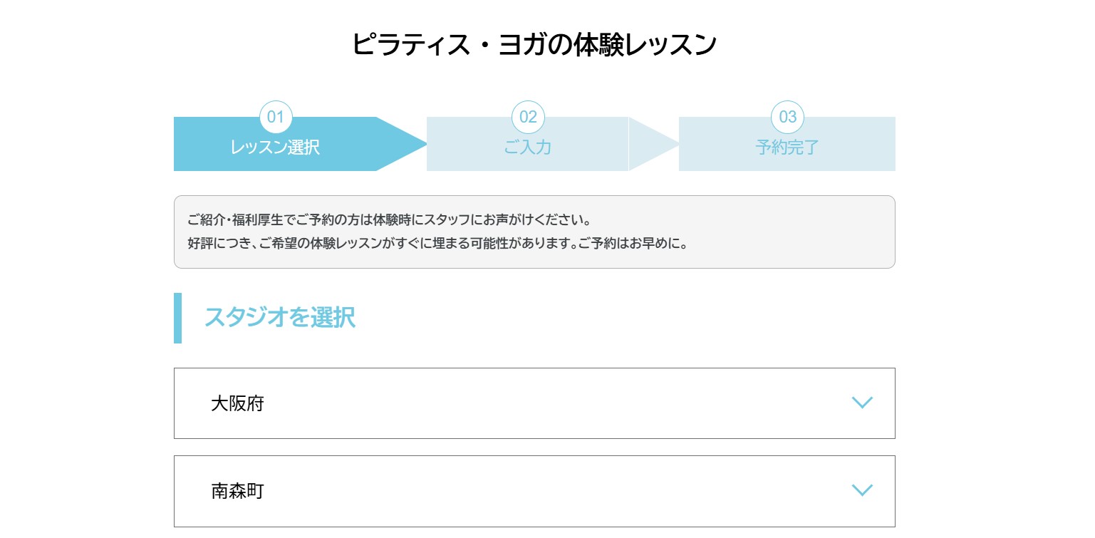公式サイトの「体験予約」から、体験レッスンの希望スタジオ・コース・日程を予約する