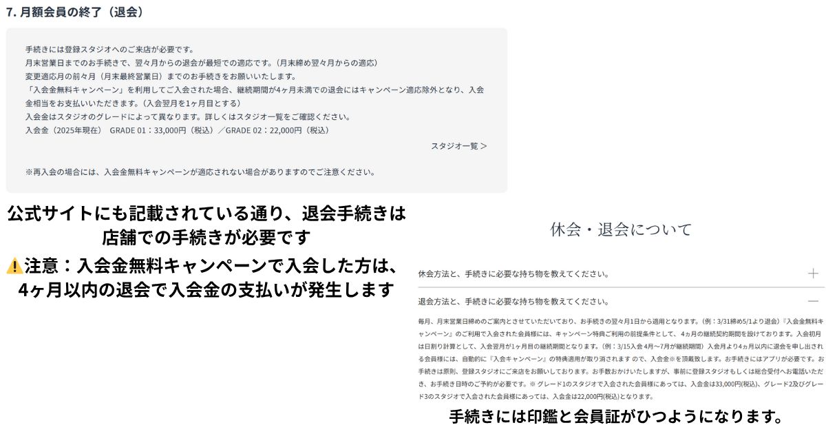通常の退会には退会費用はかかりません。ただし、入会金無料キャンペーンを利用して入会し、4ヶ月未満で退会する場合は、入会金相当額(グレード01は33,000円、グレード02は22,000円)を支払う必要があります。