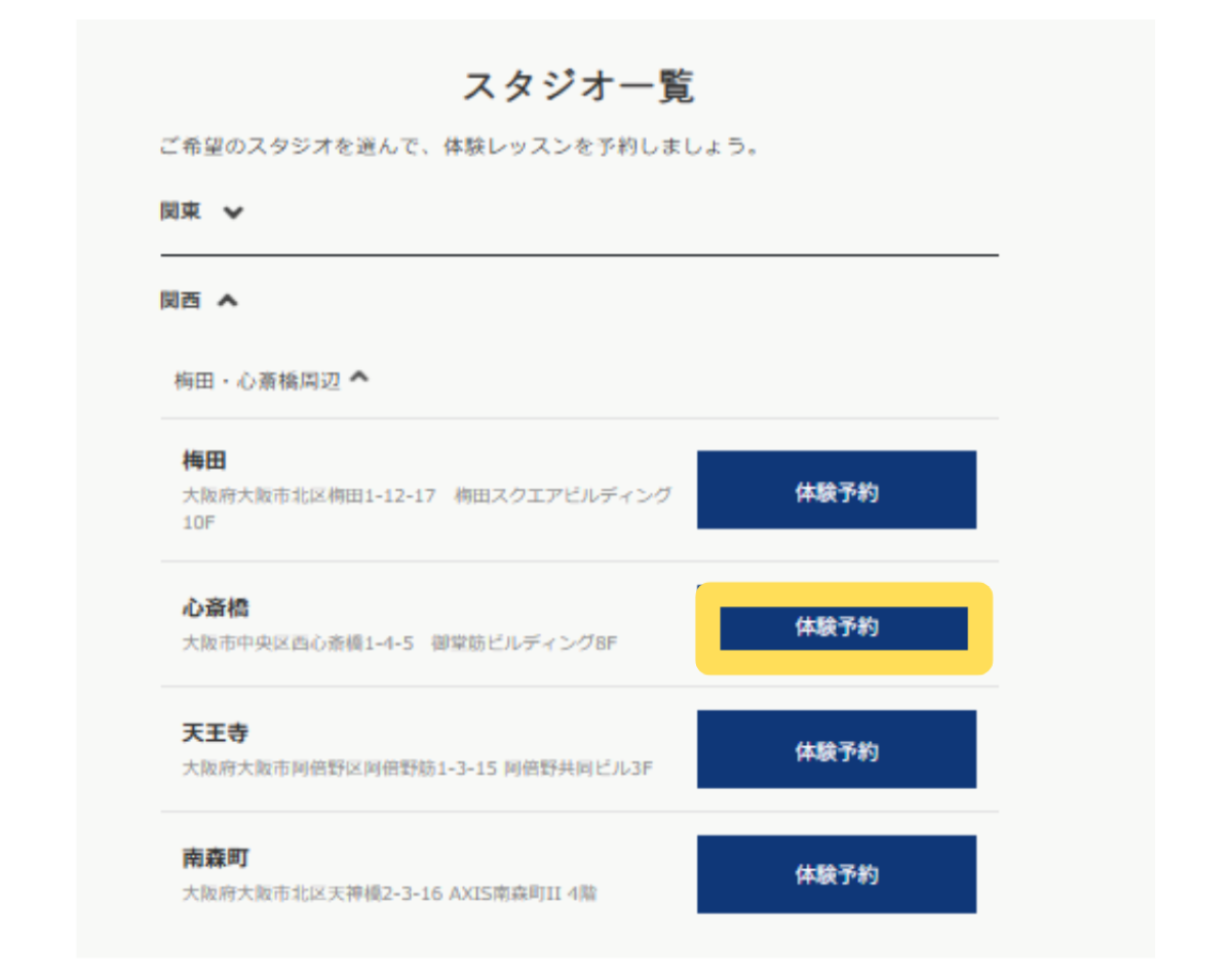 | 公式サイト | zen place ピラティス 心斎橋 | DAYS PILATES 心斎橋店 | マシンピラティス専門スタジオpilates K 心斎橋店 | ピラティススタジオPILATES STUDIO TO U 大阪心斎橋店 | ピラティススタジオDEP 心斎橋店 | CLUB PILATES 堀江店 |