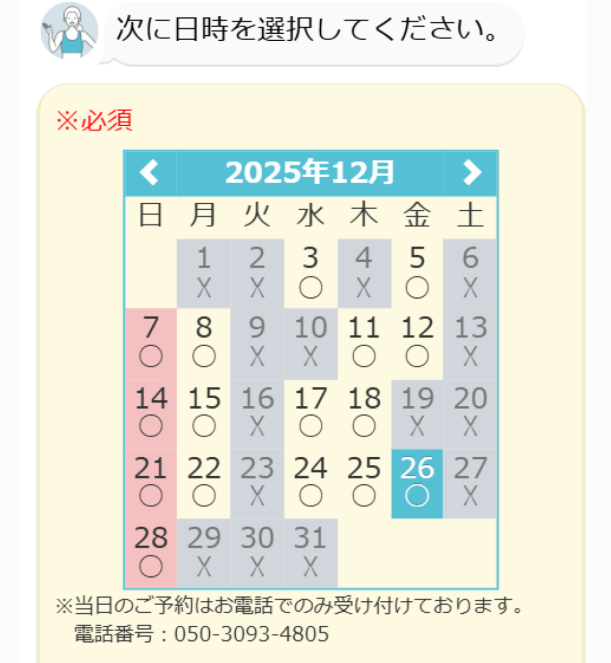 事前に登録スタジオもしくは、総合受付(050-3355-5225)までお電話で来店予約をお願いしています。