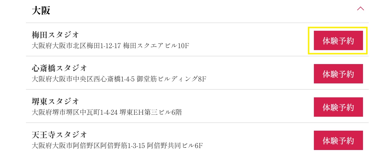公式サイトの「体験予約」から、体験レッスンの希望スタジオ・コース・日程を予約する