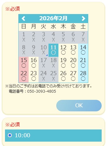 | 【平日】 10:00~21:00(最終受付/20:30)【土・祝】 10:00~21:00 (最終受付/20:30) | 【平日】 【土日祝】 |